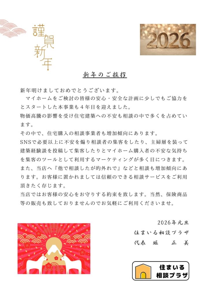 新年明けましておめでとうございます。 石川県能登半島での地震の被害に遭われた方のご無事を祈るとともに 深くお見舞い申し上げます。 昨年来よりの物価の高騰、光熱費の上昇などで住宅にまつわるご不安も 増加の傾向がありこれから […]
